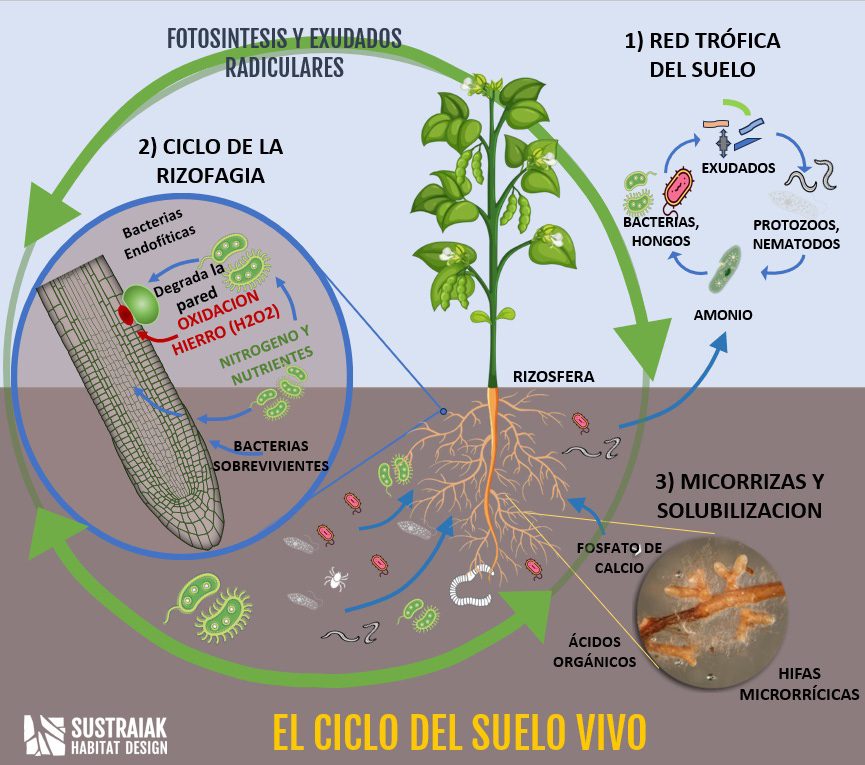 - por un lado, la comprensión y gestión de la red trófica del suelo y los mecanismos microbianos de movilización de nutrientes; por otro,