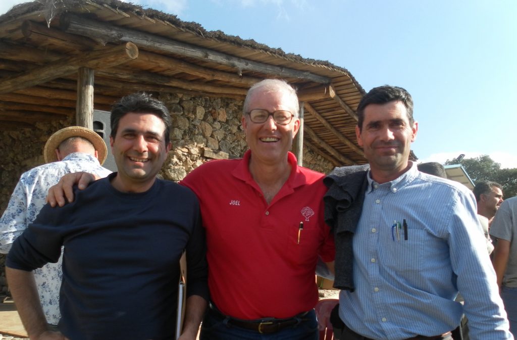 De izquierda a derecha: Juan Luis Campa, Joel Salatin, Pedro Campa. Finca La Donaira.