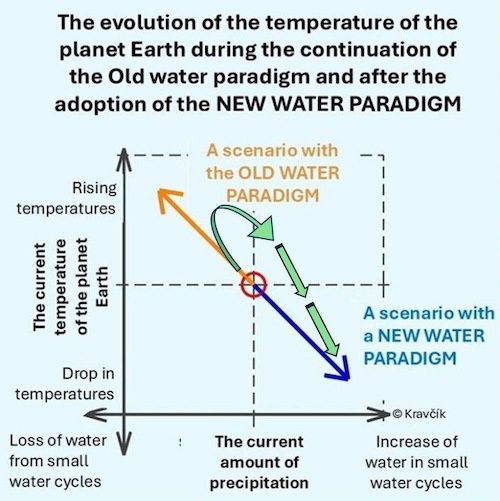 Se afirma que el cambio climático es irreversible, y a él se le atribuyen el aumento de la temperatura, desastres naturales o la falta de agua. Michal Kravcik y otros científicos invitan a mirar más allá del CO2 atmosférico a otros factores como son la ruptura del ciclo corto del agua, la destrucción de la biodiversidad, la disminución del carbono del suelo o el drenaje y desecación de los ecosistemas. La combinación de estos factores, relacionados entre sí, contribuye a desbaratar los sistemas de regulación del clima y aumentar la sensibilidad climática a las variaciones del CO2 atmosférico.